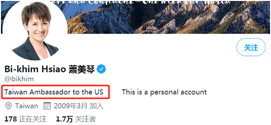 據台媒9月20日報道,台當局“駐美代表”蕭美琴最近在推特的簡介上改為“台灣駐美大使”(“Taiwan Ambassador to the US”),引發關注,連台當局領導人蔡英文都被媒體問到此事。台當局在非“友邦”的駐外機構,通常以“代表處”或“辦事處”等命名,蕭美琴推特改名也被綠媒炒作為“台灣‘外交’的又一突破”。