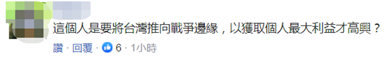 還有網友質疑:“這個人是要將台灣推向戰爭邊緣以獲取個人最大利益才高興?”↓