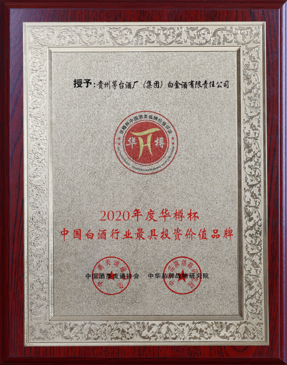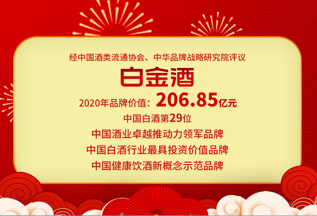 憑藉2019年在市場業績和品牌建設方面取得的突出成績,白金酒連續第三年進入華樽杯酒類品牌價值榜單,品牌價值首次突破200億元,達到206.85億元,步入中國白酒30強,位列中國白酒第29位。同時,白金酒被評為2020年度華樽杯中國酒業卓越推動力領軍品牌、2020年度華樽杯中國白酒行業最具投資價值品牌、2020年度華樽杯中國健康飲酒新概念示範品牌。