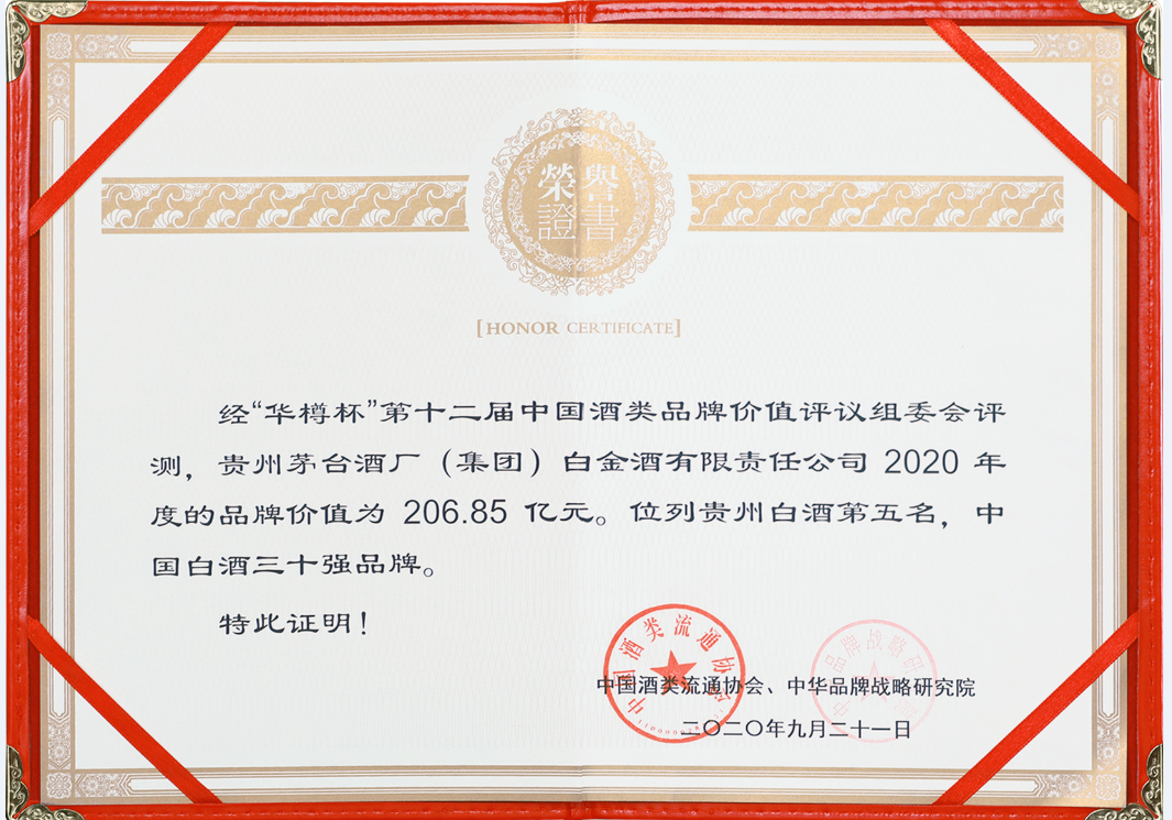2020年9月21日,由中國酒類流通協會和中華品牌戰略研究院聯合舉辦的第12屆華樽杯中國酒類品牌價值200強暨第3屆全球酒類產品100強頒獎典禮暨高峯論壇,在北京國際會議中心隆重舉行。