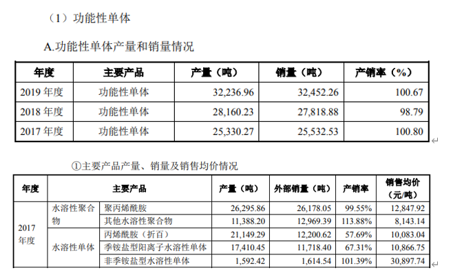 但與此同時,2018版招股書披露的“水溶性聚合物”和“水溶性單體”產量分別為3.76萬噸和4萬噸左右、其中“水溶性單體”的產銷率維持在較低水平;但是在本次招股書中,“功能性單體”的產量僅為2.55萬噸,產銷率為100.8%。在前後兩版招股書中披露的經營信息,存在明顯差異。