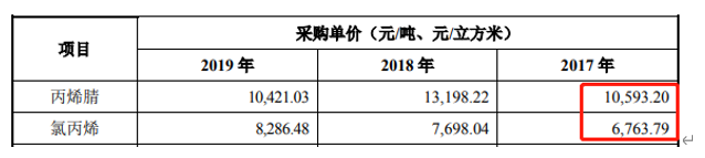 不僅是產品產量存在信息披露前後差異,富淼科技在2018版招股書和本次最新版招股書中,披露的核心原材料採購單價同樣存在差異。在2018版招股書中,富淼科技披露2017年丙烯腈、氯丙烯的採購單價分別為10592.56元/噸和6818.27元/噸,而在本次招股書中披露的採購單價則為10593.2元/噸和6763.79元/噸,均存在一定差異。