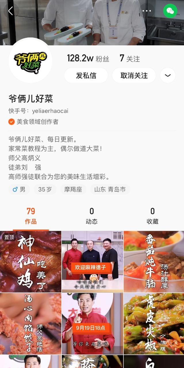 今年7月底,高炳義先生就與其徒弟劉強共同開通快手賬號,取名"爺倆兒好菜”,日常分享美食教程,獲得了不少用户的關注。入駐僅兩月,賬號粉絲就已經突破120萬,最高單條視頻播放量破1400萬+。