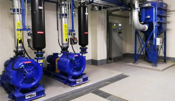 清掃真空系統可採用NASH液環真空泵或Hoffman&Lamson多級離心風機產生高負壓,也稱潔淨廠房真空或者中央吸塵系統。系統運行時,粉塵被吸入管網,在負壓的作用下,粉塵隨氣流沿着負壓管路被抽入除塵器內部,然後粉塵隨氣流向上運動進入濾袋。粉塵在經過濾袋過濾腔室時被濾袋分離出來,清潔的空氣由風機排風口排至空氣中。附着在濾袋錶面的粉塵通過自動脈衝反吹系統定時交替反吹進行清理。在進入主機的管道處設置止回閥,以免反向流動的氣流將粉塵再次帶入清潔區內,保證吸塵的有效性。