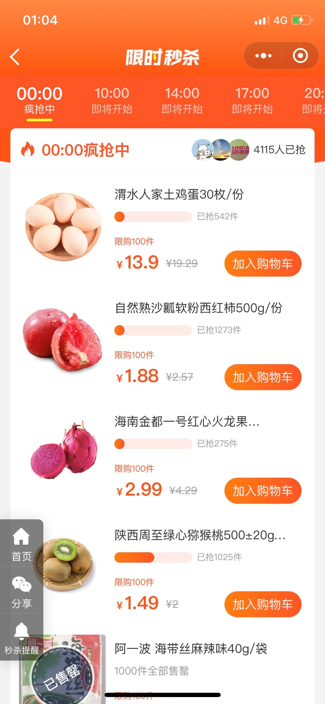 在橙心優選的小程序上,每天都會有多場的“秒殺”活動,秒殺價低至0.99元,還會不定期上線滿額返券、購物滿減、週末狂歡等各類優惠促銷活動。在小程序上可以看到,平台還為西安的鄰居們提供了冬棗、蜜桔、柿子等多種應季商品及老潼關餅坯、手抓餅等西安特色商品,滿足西安鄰居所需。