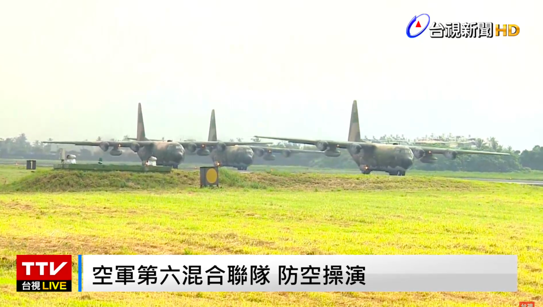 22日上午開始,台空軍第六混合聯隊舉行防空操演,圖為 c-130運輸機(台視新聞視頻截圖)