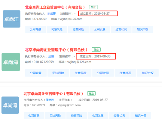 但有意思的是,工商資料顯示,卓尚灣、卓尚海、卓尚江三家公司的成立日期均晚於2019年8月15日,其中卓尚灣、卓尚江成立於2019年8月27日,卓尚海成立於2019年8月30日。