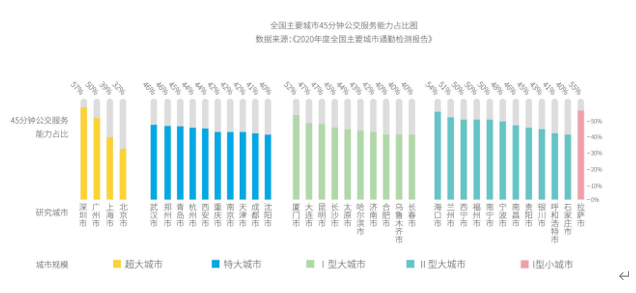 然而,在實際通勤的便利度上,各大城市距離租住青年的理想要求均有差距。據《2020年度全國主要城市通勤監測報告》中,研究人員統計了各城市“45分鐘內能夠通過軌道、地面公交等公共交通方式通勤的人口比重”。數據顯示,在統計的36個城市中,僅深圳的公交系統與職住空間的契合程度最高,達到75%;北京的契合程度最低,僅有32%。