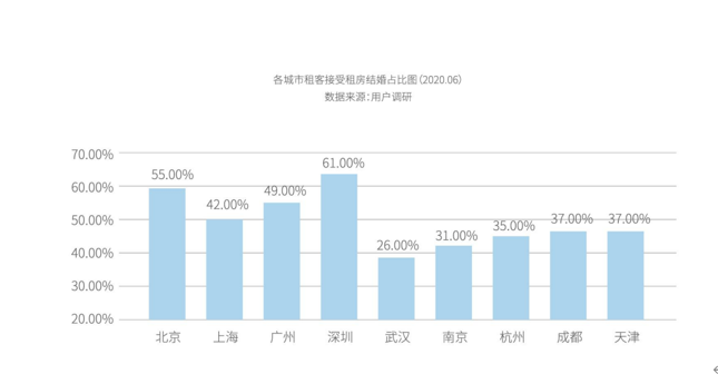 另一方面,在“是否接受在租來的房子裏結婚”這一話題上,城市租住一族呈現出了多種態度。整體來看,《藍皮書》數據顯示,在城市整體租住羣體中有約半數租客選擇接受“房子是租來的但生活不是”並願意租房結婚。其中,北京有55%的租客願意“租房結婚”;深圳最高,達61%;上海、廣州也均超過40%。