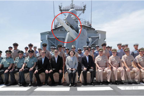 台媒稱,通過軍方拍攝的照片發現,蔡英文和隸屬146艦隊的成功級巡防艦“子儀艦”官兵合照時,有別於過去對外公開的藍色彈身(訓練彈),蔡英文身後“子儀艦”上Mk13導彈發射器掛載的是白色標準一型導彈戰彈,是一枚可以發射的戰彈,台媒稱引舉“相當罕見”,也引發高度關注。↓