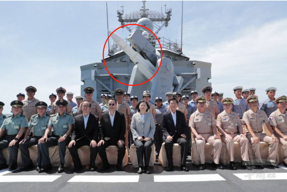台媒稱,通過軍方拍攝的照片發現,蔡英文和隸屬146艦隊的成功級巡防艦“子儀艦”官兵合照時,有別於過去對外公開的藍色彈身(訓練彈),蔡英文身後“子儀艦”上Mk13導彈發射器掛載的是白色標準一型導彈戰彈,是一枚可以發射的戰彈,台媒稱引舉“相當罕見”,也引發高度關注。↓