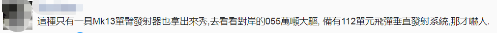 還有島內網友説,把只有一具Mk13單臂發射器也拿出來秀,去看看對岸的055萬噸大驅, 備有112單元導彈垂直髮射系統,那才嚇人。↓