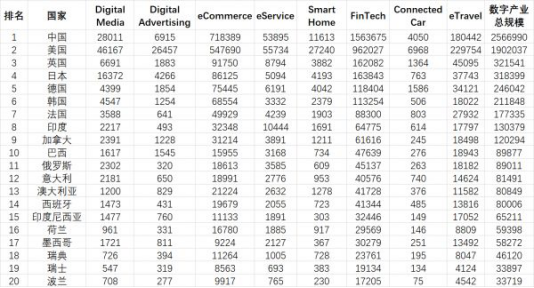 2019年全球數字產業規模排名TOP20(單位:百萬美元)