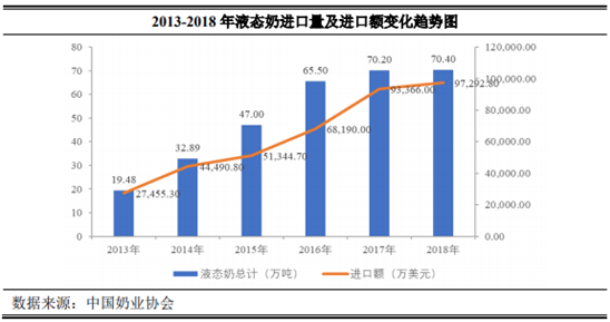 根據中國奶業協會統計,液態奶(包括HS0401 和 HS0403)進口量從 2013年的 19.48 萬噸增長至 2018 年的 70.40 萬噸,年複合增長率高達 29.30%,進口額從 2013 年的 27,455.30 萬美元增長至 2018 年的 97,292.80 萬美元,年複合增長率達 28.79%。2013 年至 2018 年,中國酸奶進口量從 1.02 萬噸增長至 3.08 萬噸,年複合增長率達 24.74%,中國液態奶進口市場需求量巨大。