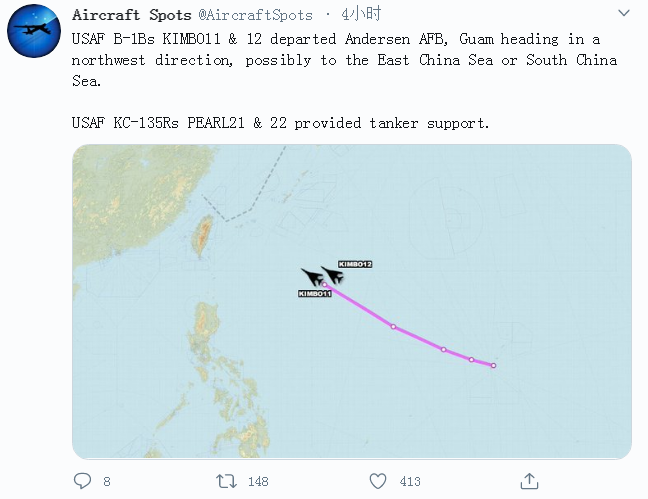 報道援引記錄軍機動態的推特賬號“飛機守望”發佈的信息稱,在台海局勢緊張之際,2架美軍B-1B轟炸機從關島安德森空軍基地起飛後向西北方向飛行,未來可能到東海或南海。“三立新聞網”更是對“飛機守望”發佈的美軍B-1B轟炸機飛行路線圖進行了解讀,稱從圖中可以看出去,這兩架B-1B轟炸機正朝着台灣的方向飛來。
