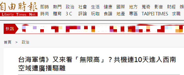 台媒稱解放軍戰機連續10天進入台西南空域,還炒作“與台灣導彈試射時機巧合”