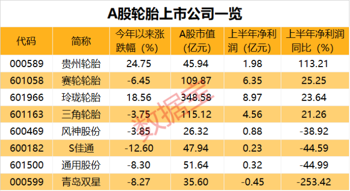 輪胎行業受疫情影響嚴重,業績增長阻力較大,就連米其林、美國固鉑輪等幾家全球輪胎巨頭上半年業績均出現虧損情況。根據證券時報·數據寶統計,A股輪胎上市公司共有8家,其中貴州輪胎、賽輪輪胎、三角輪胎和玲瓏輪胎4家公司上半年業績增長,貴州輪胎淨利同比增長113.21%,其餘3家公司增幅均超20%。