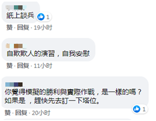 然而就媒體披露的台軍在這場推演中靠“奇襲”取勝的説法,社交媒體臉書上有島內網友留言酸諷:“紙上談兵”、“自欺欺人的演習”、“你覺得模擬的勝利與實際作戰,是一樣的嗎?”
