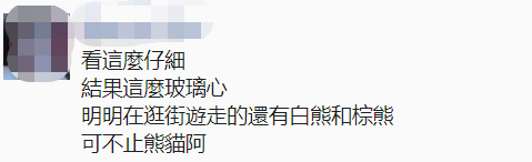 台北市議員陳怡君的一番話引來島內網友嘲諷:看得這麼仔細,這麼玻璃心,明明在逛街遊走的還有白熊和棕熊,可不止大熊貓。↓