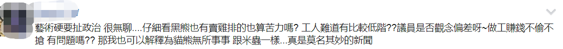 有網友説,藝術硬要扯政治 很無聊。此外,仔細看黑熊也有賣雞排的,也算苦力嗎?做工賺錢不偷不搶 有問題嗎?↓