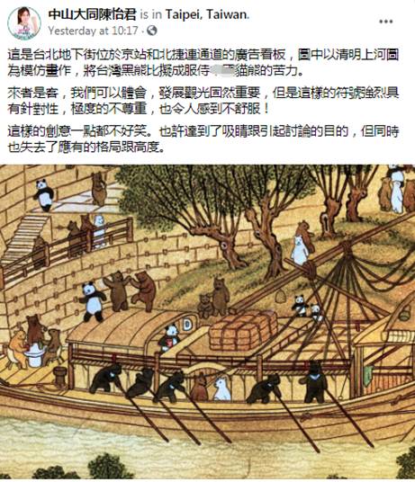 據台灣《自由時報》報道,昨天(26日),台北市議員陳怡君突然發帖,稱“熊熊上河圖”“具有針對性、是極度的不尊重,令人感到不舒服。”她認為,畫中的台灣黑熊看起來是在服侍來自大陸的大熊貓,“這樣的創意失去了應有的格局跟高度”。