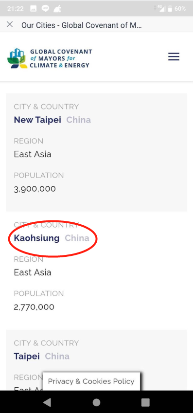 據台灣“中時新聞網”等台媒報道,在“全球氣候能源市長盟約”(Global Covenant of Mayors for Climate & Energy)官方網站上,介紹高雄城市的網頁,可以明顯看出高雄所屬國家被標註為“中國”(China)。記者查詢“市長聯盟”官網發現,除了高雄外,台灣其它5個城市新北市、台北、桃園、台南、台中也標為“中國”(China)。