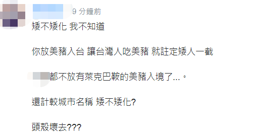 對此,有島內網友想到了民進黨當局決定開放含有瘦肉精的美國豬肉進口一事:“矮不矮化我不知道,你放美豬入台,讓台灣人吃美豬,就註定矮人一截”。↓