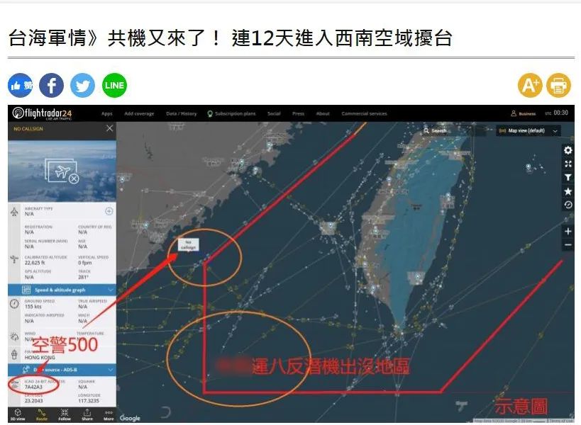 報道還稱,據台灣資深軍迷分析,解放軍今天派出的應當還是運-8型反潛機,而另外在汕頭外海6900米的高度還疑似出現了一架空警-500預警機提供預警指揮。