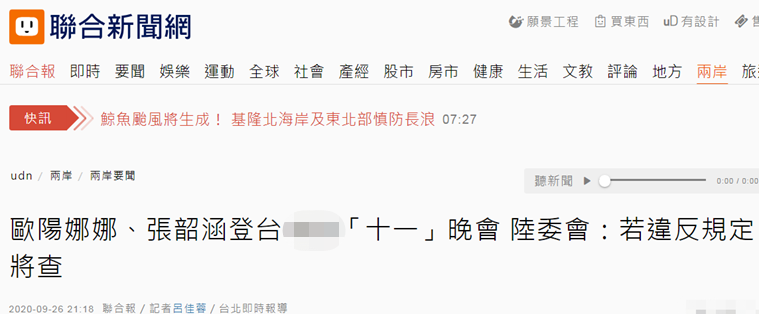 台灣藝人歐陽娜娜、張韶涵將分別在央視國慶晚會與他人合唱《我的祖國》《守護》,台灣陸委會威脅稱若違反兩岸條例相關規定,將依法查處。