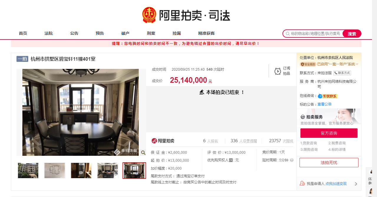 杭州法拍豪宅火爆!一洋房1300萬起拍,547輪競價,2514萬成交