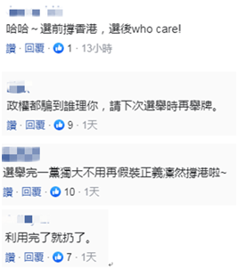 此外,還有網友表示,“選前撐香港,選後who care!”“政權都騙到誰理你,請下次選舉時再舉牌。”“選舉完不用再假裝正義凜然撐港啦。”