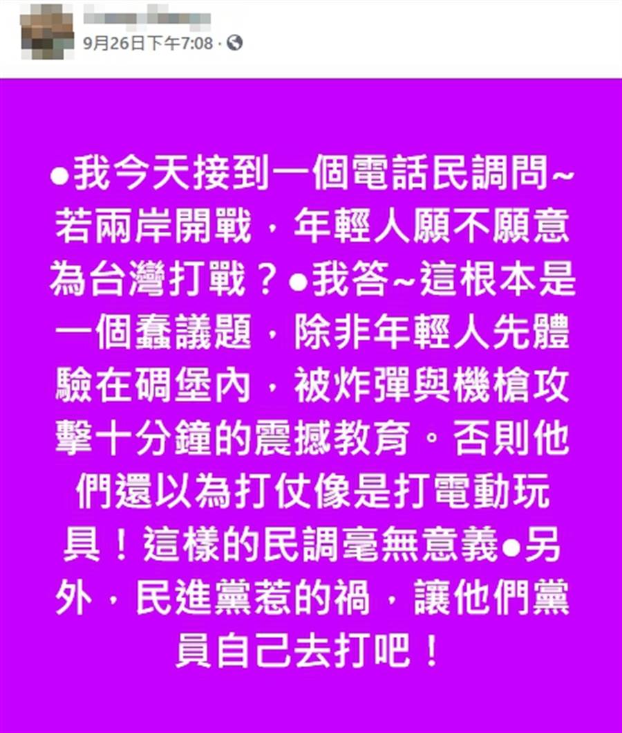 “中時新聞網”稱,兩岸關係日趨緊張,也讓開戰問題成熱議焦點。有島內網友爆料自己接到電話民調問“年輕人願不願意為台灣打仗”,該網友在臉書發文,這樣回答:“這根本是一個蠢議題,除非年輕人先體驗在碉堡內被炸彈與機槍攻擊十分鐘的震撼教育,否則他們還以為打仗像是打電動玩具!這樣的民調毫無意義!另外,民進黨惹的禍,讓他們黨員自己去打吧!”