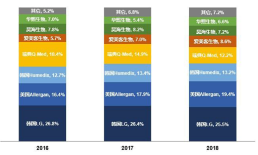 據弗若斯特沙利文報告顯示,2016年至2018年,愛美客產品在中國醫療美容透明質酸領域市場佔有率分別為 5.70%、7.0%及8.5%,已超越昊海生科成為我國市場佔有率第一的本土品牌。