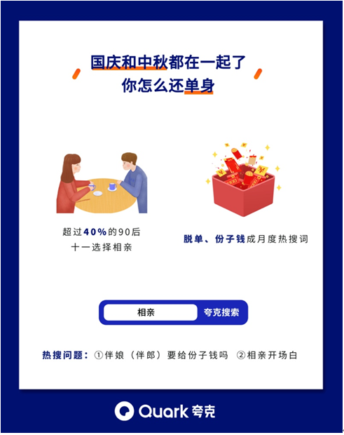 國慶節和中秋節撞檔約19年一遇,雙節疊加也給了今年十一長假更多温馨的色彩。夸克大數據顯示:除了返鄉與家人中秋團圓的安排之外,超過40%的90後還會選擇利用這個時間相親擇偶。同時,脱單、份子錢等詞彙和話題登上熱搜也表明:即將到來的十一假期必將甜蜜轟炸、婚禮密集。有網友發出靈魂拷問:“國慶和中秋都在一起了,你怎麼還在單身?”