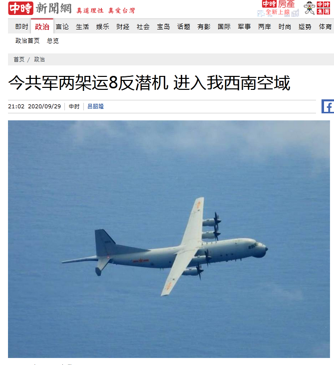 快訊!台空軍宣稱解放軍兩架次運8反潛機進入台西南空域,台軍進行“防空導彈追監”