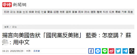 【環球網報道 記者 尹豔輝】據台灣中時新聞網9月29日報道,民進黨當局前不久宣佈將開放含瘦肉精的美國豬肉進口,藍營曾對此提出質疑。台“行政院長”蘇貞昌宣稱要向美國説“國民黨反對美豬”。今日(29日),國民黨“立委”陳以信在台“立法院”質詢蘇貞昌時問:有告狀嗎?用英文説嗎?蘇貞昌回答“有,用中文。”