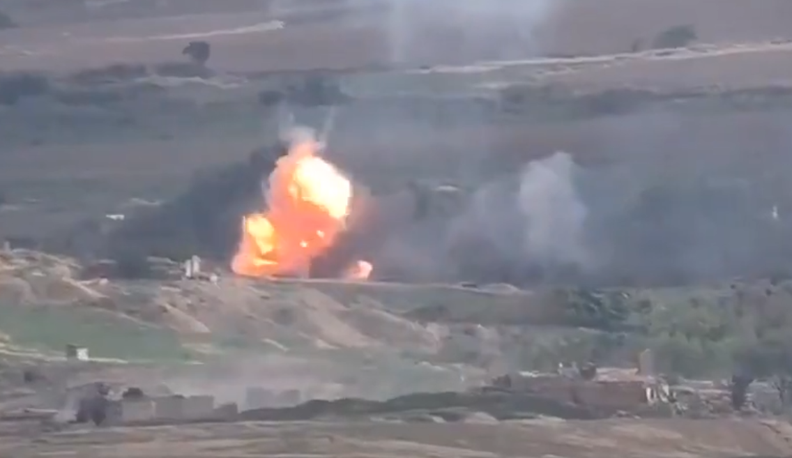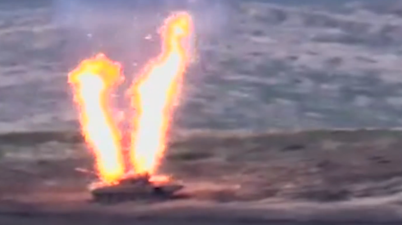 阿塞拜疆坦克被亞美尼亞導彈擊中後引發彈藥艙爆炸,現場火光沖天。