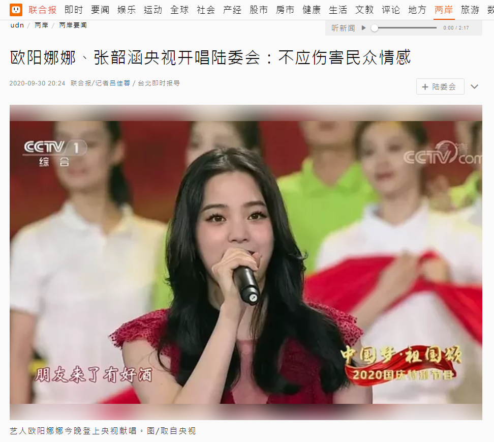 據台灣“聯合新聞網”30日報道,歐陽娜娜與張韶涵今晚登上央視獻唱,台陸委會晚間則在官網發佈新聞稿,其中宣稱,“中共近期對台加大軍事恫嚇力度,不斷以機艦跨越‘海峽中線’進行‘挑釁’……此時台灣藝人若被利用參加具有消滅‘中華民國’意涵的‘十一’國慶活動,豈不是傷害了台灣民眾的感情。”