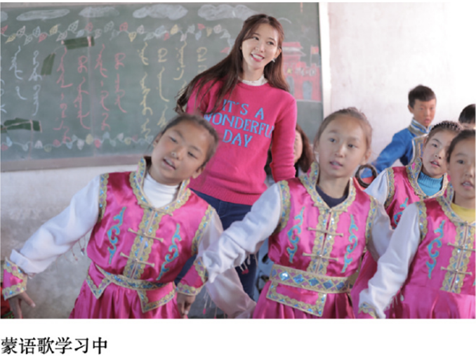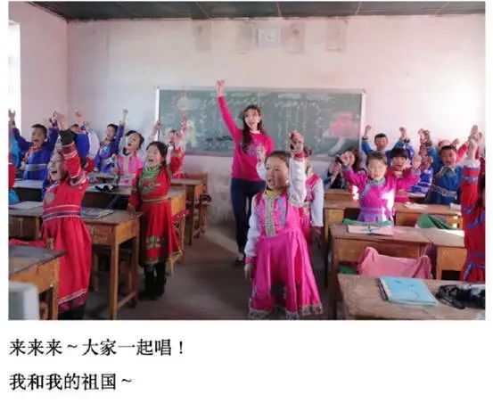 在她與孩子們的兩張合影中,她自己給出的配文是:來來來,大家一起唱《我和我的祖國》以及“蒙語歌學習中”。↓。