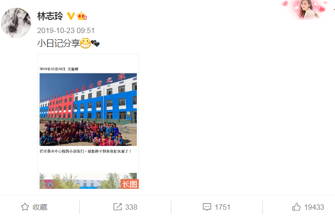 第二天(23日),林志玲又在微博以長圖的形式分享了一則小日記。根據日記記載,林志玲10月14日來到2016年落成的“志玲姐姐兒童之家”。↓