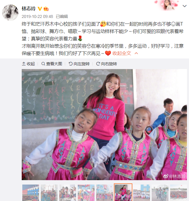 去年10月22日,林志玲在微博發文稱自己來到內蒙古通遼市庫倫旗茫汗蘇木中心校跟孩子們見面,跟他們一起畫T恤、拋綵球、舞方巾、唱歌。↓