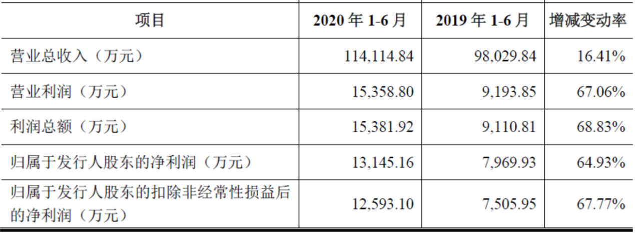 2020 年1-6 月,奧海科技實現營業總收入為11.41億元,較上年同期上升16.41%;營業利潤為1.54億元,較上年同期增長67.06%;實現歸母淨利潤為1.31億元,較上年同期增長64.93%。隨着公司競爭優勢不斷得到提升,銷售規模進一步增長,以及產品銷售結構和產品技術不斷優化、客户產品升級或迭代等提升了產品毛利率,從而推動公司業績持續快速增長。