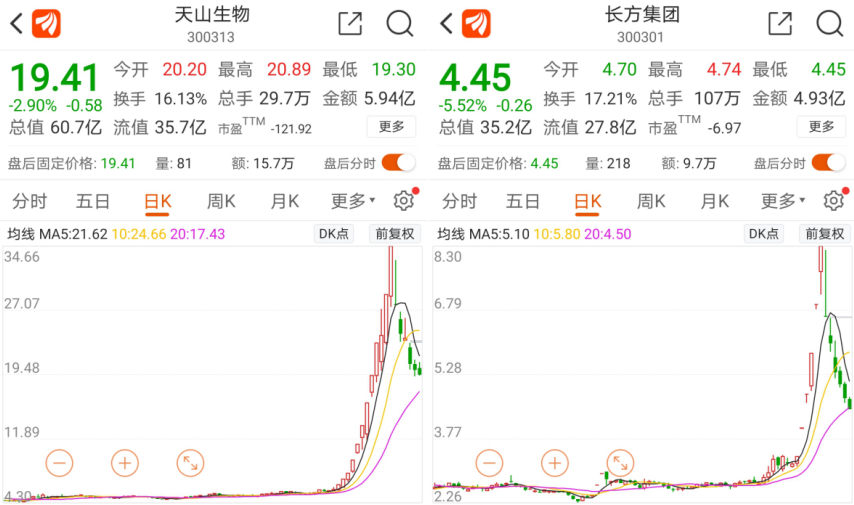 天山生物股價從34.56元,下跌到了19.41元,跌幅接近44%,長方集團從8.30元跌到了4.45元,跌幅達到46%,此外豫金剛石復牌以來的跌幅也超過35%。