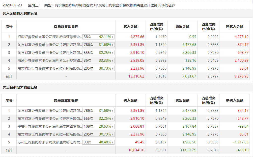 此外,9月22日,平安證券深圳深南東路羅湖商務中心營業部22日買入1344.72萬元,23日賣出2068.81萬元。海通證券深圳分公司華富路營業部22日和23日連續買入2145.07萬元和2539.05萬元。但從交易行為上看,這兩個營業部席位更像是特停之後的努力自救,逃生慾望遠遠大於炒作慾望。