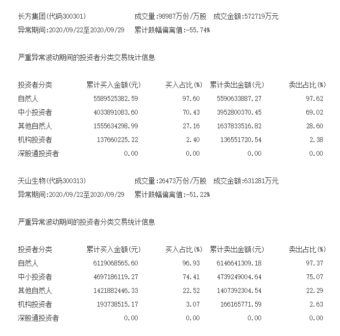深交所9月29日披露,天山生物在9月22日到9月29日漲幅嚴重異常期間,獲自然人買入61.2億元,佔比96.93%。其中,中小投資者累計買入超46億元,佔比74.41%。機構投資者買入佔比3.07%。同期,長方集團獲自然人買入55.89億元,佔比97.62%。