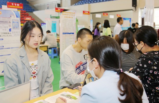 9月19日,江蘇省南通科技職業學院舉行的2021屆畢業生校園秋季大型雙選會上,大學生向用人單位諮詢情況。