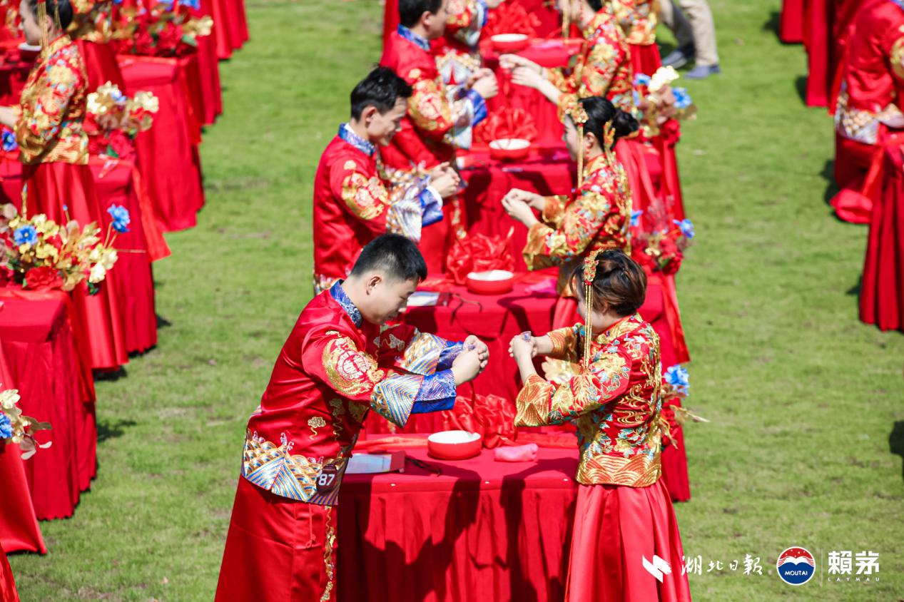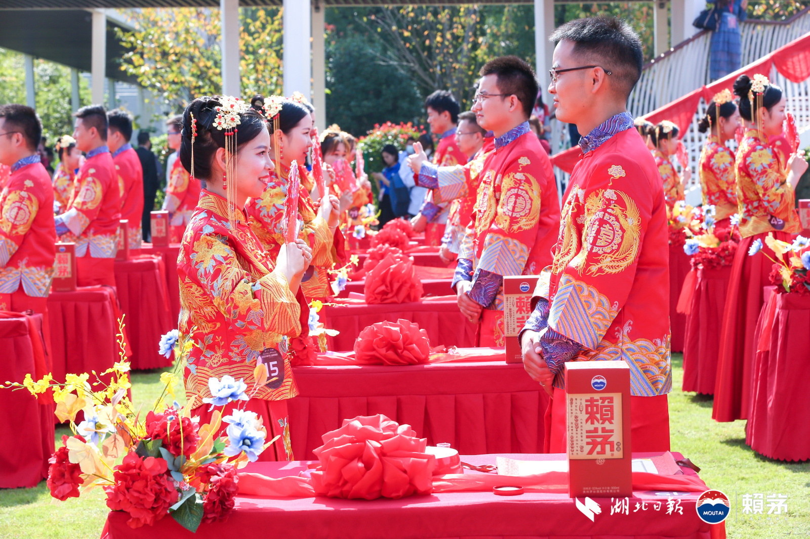 這場集體婚禮選在雅緻時尚、臨江攬勝的青山江灘臨江親水儀式堂舉行,精心佈設的婚禮會場處處洋溢着幸福與温馨的氣息。10月1日上午,身着中國傳統秀禾禮服的99對新人依次走過長廊,進入婚禮會場,開始這場莊嚴而盛大的集體婚禮,湖北省民政廳、湖北日報和賴茅酒業的有關領導為99對新人送上熱忱的祝福。