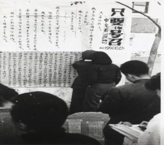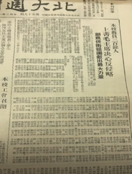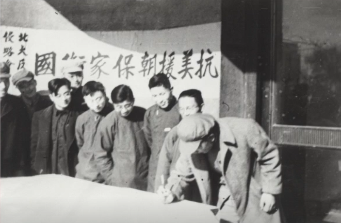 11月6日,北京大學發佈《本校全體教職員工學生擁護各民主黨派聯合宣言的通電》,保證以各種積極有效的方式為抗美援朝保家衞國的神聖任務而奮鬥。在北大檔案館有關抗美援朝的照片集中,有兩張照片記錄了當時北大教職員在現場簽名擁護各民主黨派聯合宣言的真實場景:在北大反侵略委員會《抗美援朝保家衞國》宣傳橫幅的映襯下,每一位教職員的表情都是嚴肅而堅定的,懷着對新中國的熱愛、對抗美援朝的支持而鄭重簽字。