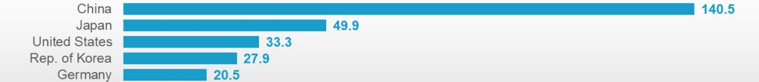 根據報告,全球範圍內,2019年工業機器人年度安裝量排名前五的市場分別是中國、日本、美國、韓國和德國。