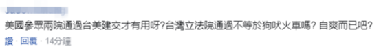 然而,對於部分綠媒的説法,有網友表示,“美國參眾兩院通過台美‘建交’才有用呀?台灣‘立法院’通過不等於狗吠火車嗎?自爽而已吧?”↓
